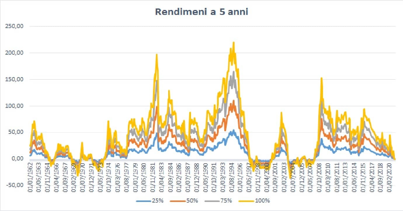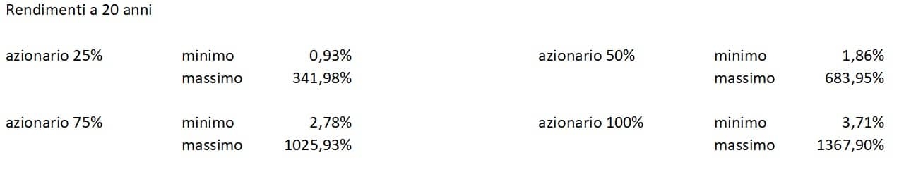 I conteggi sono stati fatti considerando l'indice S&P 500 per la parte azionaria e liquidità per quanto riguarda la parte restante (per cui rendimento 0), in quanto non ho trovato un indice obbligazionario internazionale che mi facesse avere dati con una certa profondità temporale (per l'S&P 500 ho usato i dati mensili da gennaio 1962 ad oggi). Inoltre sono stai considerati investimenti a versamento unico tenuto per 5, 10, 15, 20 anni rispettivamente, mentre nel fondo pensione dovrebbe esserci una certa regolarità di accantonamenti.