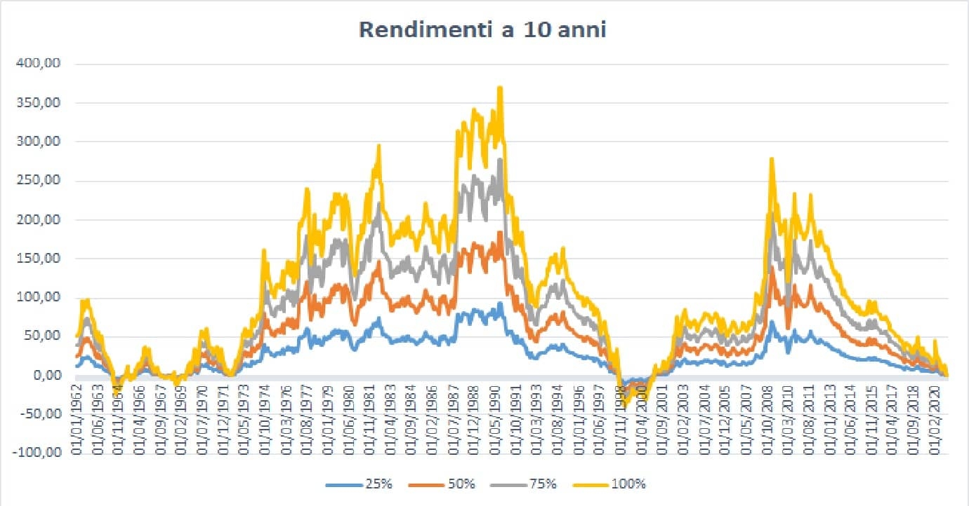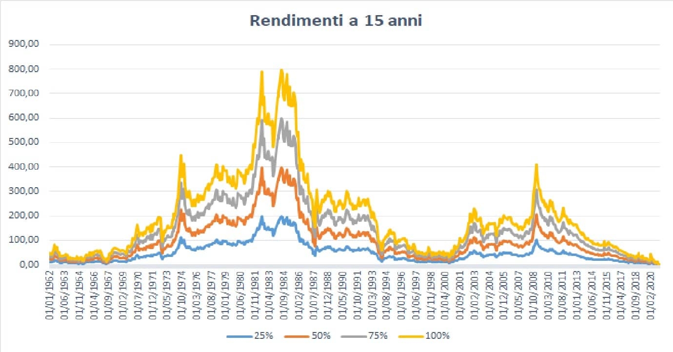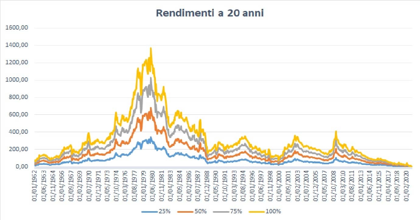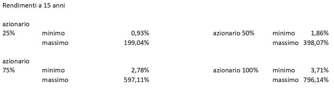 Andando dai 15 ai 20 anni sicuramente ci si può portare ad una esposizione del 75% sul mercato azionario, potendosi già parlare di lungo periodo in cui il trend azionario è sempre crescente.