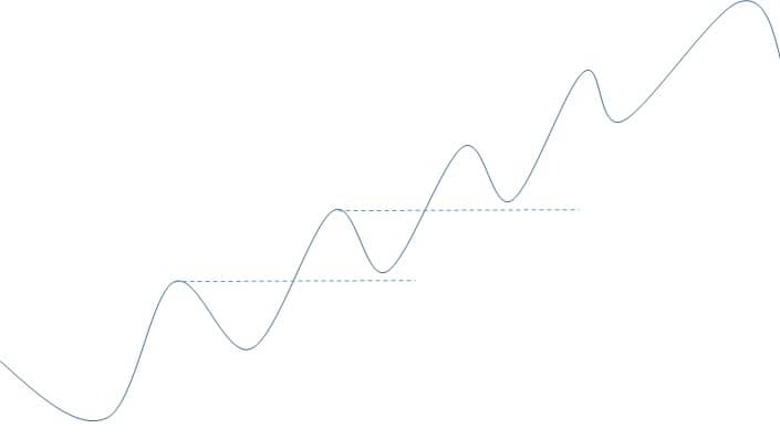 Solitamente si ragiona l'investimento sul mercato azionario in un orizzonte di 5/7 anni. Perché, in teoria, il mercato globale, in un'ottica temporale di questa dimensione, dovrebbe comunque permettere di avere un guadagno anche se sono entrato sui momenti di massimo del mercato ed esco sui momenti di minima del ciclo economico successivo (essendo l'economia una sinusoide con tendenza al rialzo) come riportato nell'esempio grafico sottostante.