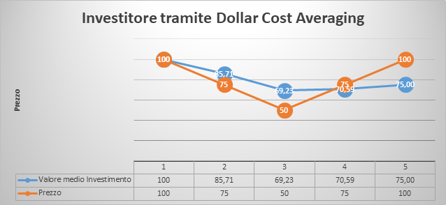 Il metodo del dollar cost averaging prevede, invece, la suddivisione di una cifra che ho già a disposizione o che mi voglio creare tramite il risparmio futuro, in vari versamenti periodici per calmierare le oscillazioni che ci saranno inevitabilmente sul mercato azionario.