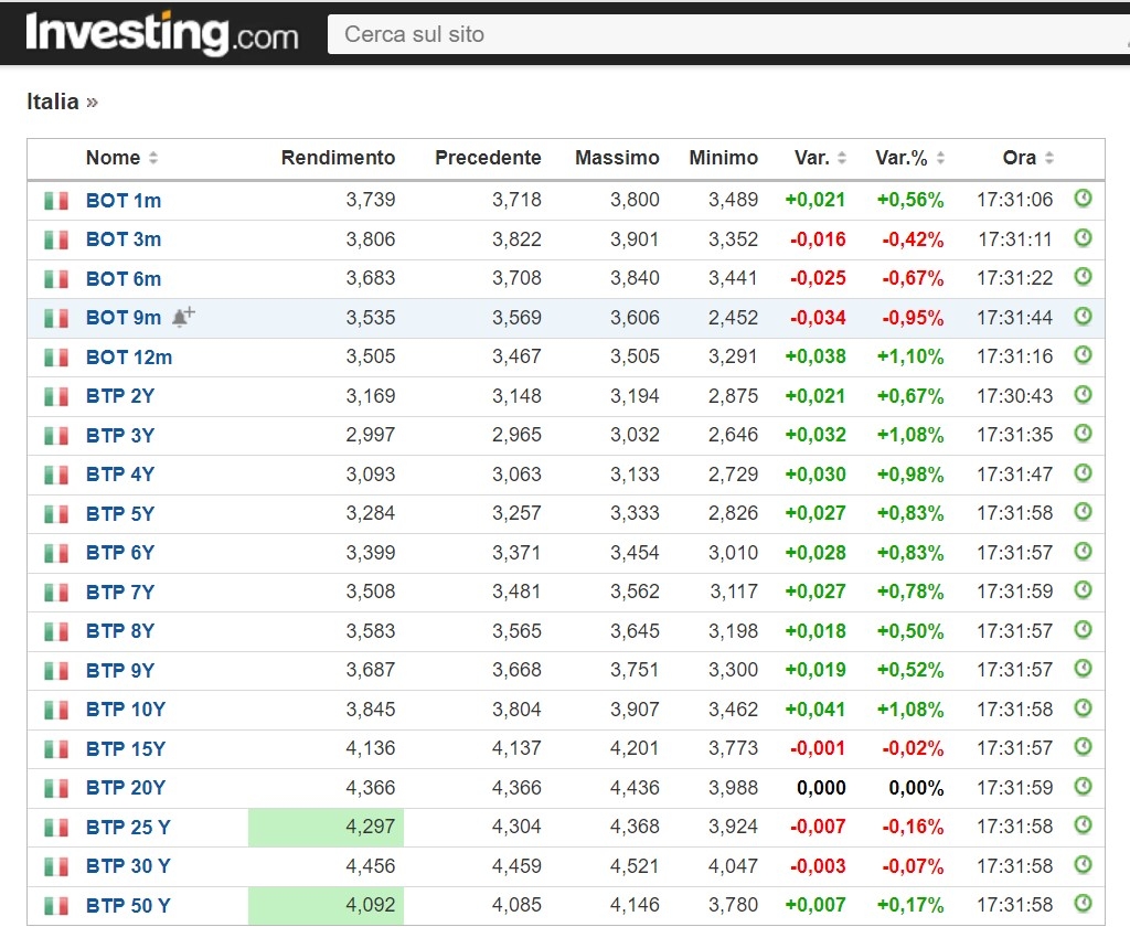 Prendendo in considerazione i tassi dei titoli di stato italiano rilevati dal sito investing.com il 09/01/2024 alle 17:30