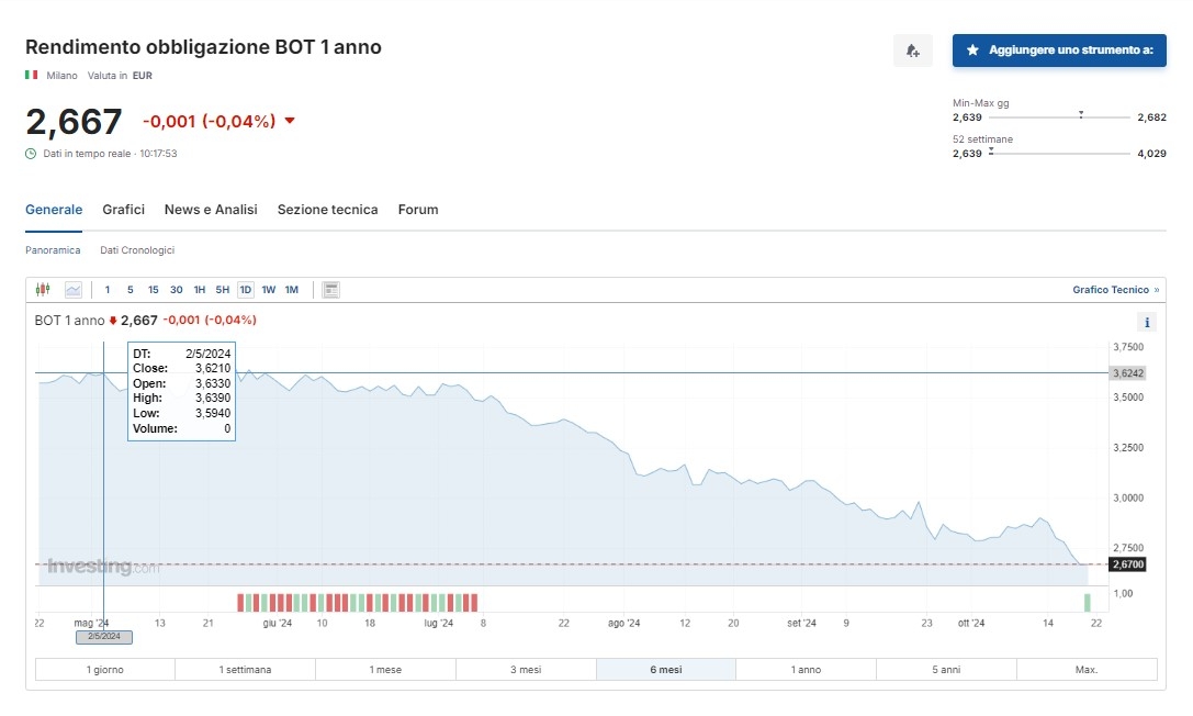 Figura 1 Andamento rendimento titoli di Stato Italiano 1 anno da aprile 2024 al 21 ottobre 2024 dal sito investing.com